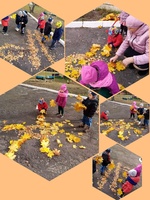 Воспитанники первой младшей группы вместе с воспитателем рисовали узоры на асфальте из листьев. При этом они рассматривали листочки, учились находить с ветки какого дерева он упал, различали листья по форме, цвету, размеру.